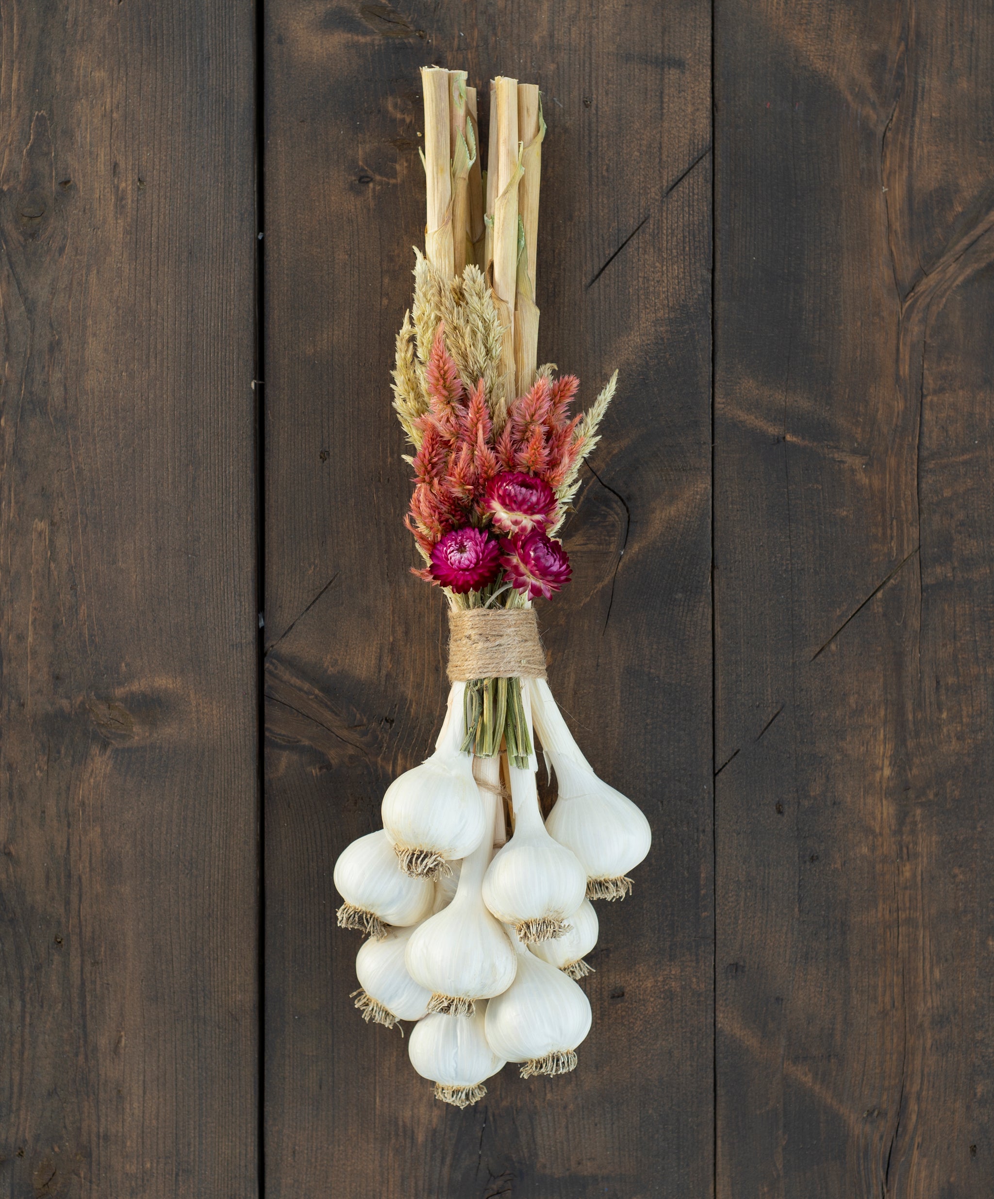 Made with an assortment of dried flowers and Music garlic grown on farm